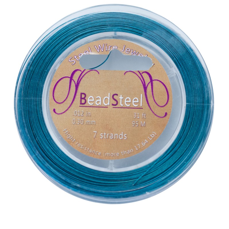 - Hilo de acero compuesto por 7 hilos de color turquesa. El carrete tiene 95 metros y el grosor del hilo es de 0,30mm.