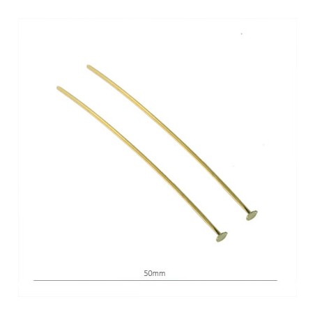 - Alfiler con tope plano de latón en color cobre. - El tamaño es de 50x0,8 milímetros. - El precio es por bolsa y la bolsa incluye 50 unidades.