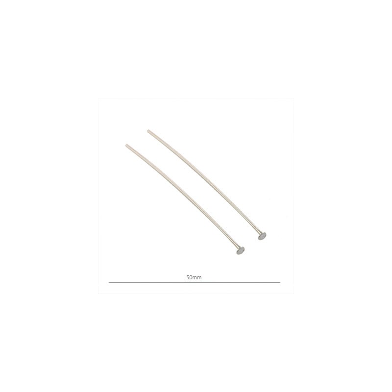 - Alfiler con tope plano de latón en color plata. - El tamaño es de 50x1 milímetros. - El precio es por bolsa y la bolsa incluye 50 unidades.