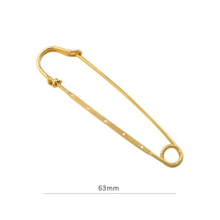 Imperdible con 5 taladro de latón en color dorado. La bolsa contiene 1 unidad y el tamaño es de 63 mm.
