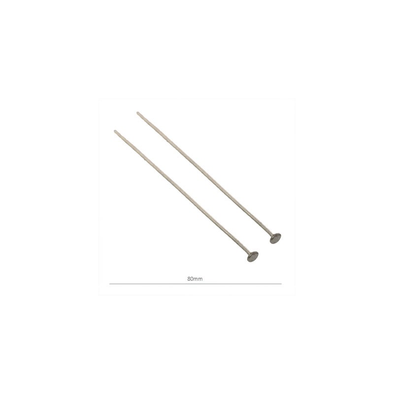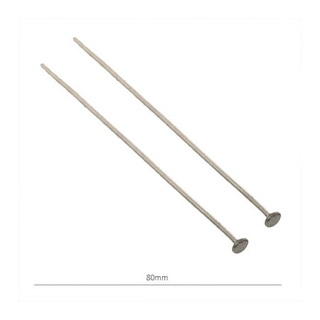 - Alfiler con tope plano de latón en color plata vieja. - El tamaño es de 80 milímetros. - El precio es por bolsa y la bolsa contiene 4 unidades.