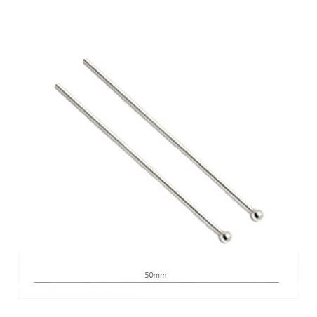- Alfiler con bola de latón en color plateado. - El tamaño es de 50 milímetros. - El precio es por bolsa y la bolsa contiene 25 unidades.