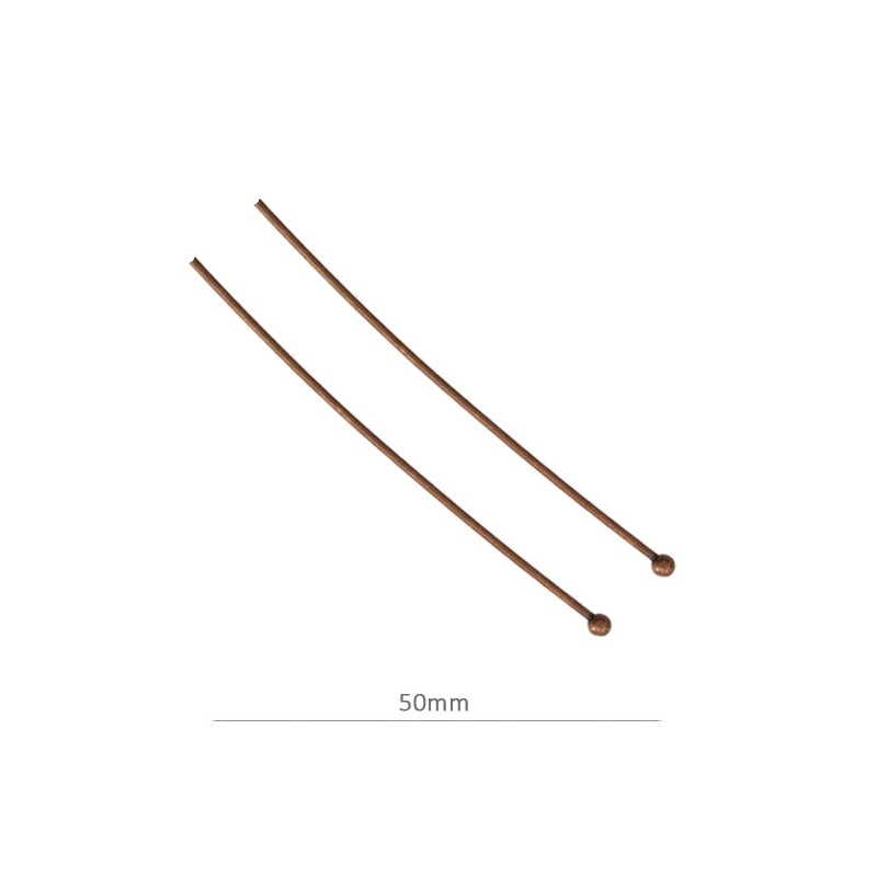 - Alfiler con bola de latón en color cobre. - El tamaño es de 50 milímetros. - El precio es por bolsa y la bolsa contiene 25 unidades.