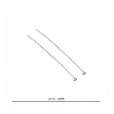 - Alfiler con tope plano de latón en color plata. - El tamaño es de 30 milímetros aproximadamente y el tope de 3 milímetros. - El precio es por bolsa y la bolsa contiene 50 unidades.