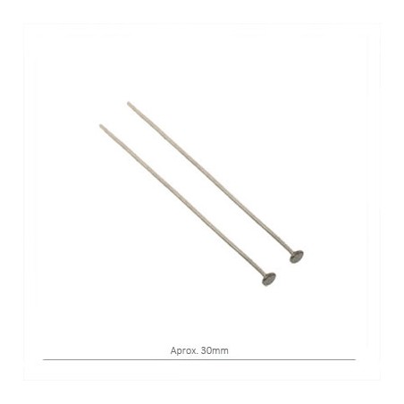 - Alfiler con tope plano de latón en plata vieja. - El tamaño es de 30 milímetros aproximadamente y el tope de 3 milímetros. - La bolsa contiene 50 unidades.