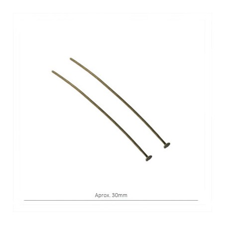 - Alfiler con tope plano de latón en color oro viejo. - El tamaño es de 30 milímetros aproximadamente y el tope de 3 milímetros. - La bolsa contiene 50 unidades.