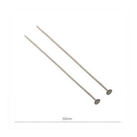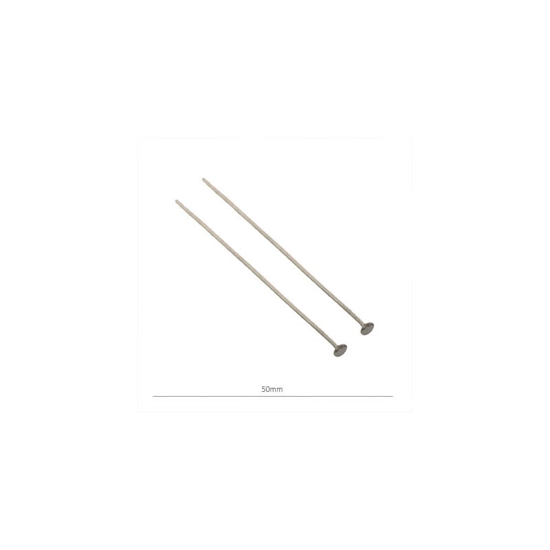 - Alfiler con tope plano de latón en color plata vieja. - El tamaño es de 50x0,8 milímetros. - El precio es por bolsa y la bolsa incluye 50 unidades.