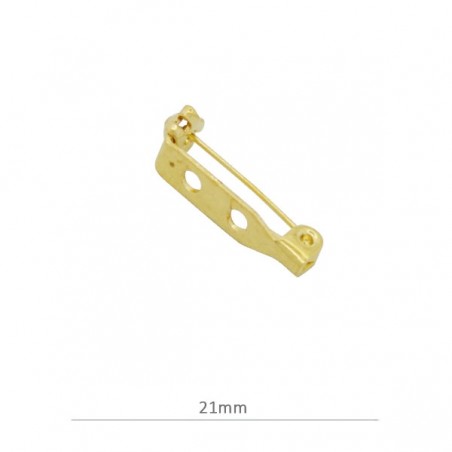 Imperdible base plana de 2 taladros con cierre seguridad de latón en color dorado. La bolsa contiene 10 unidades y el tamaño es de 21 mm.