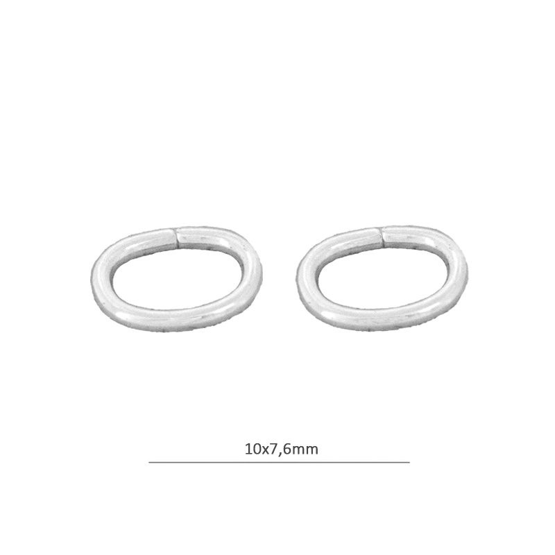 - Anilla ovalada abierta de latón en color plata vija. - El tamaño es de 7,6x10 milímetros y el grosor es de 1.3 milímetros. - El precio es por bolsa y la bolsa contiene 5 unidades.