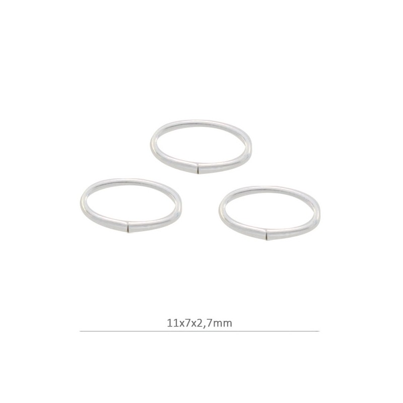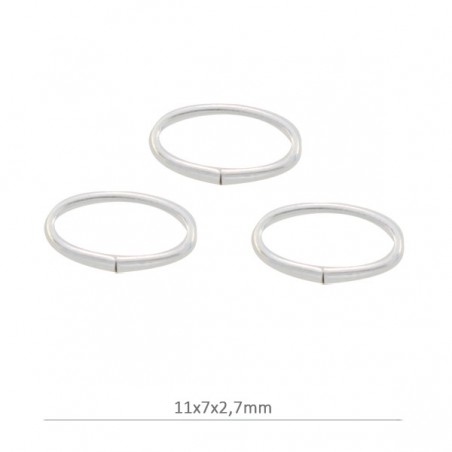 - Anilla ovalada grapa de latón en color plateado. - El tamaño es de 11x7 milímetros y tiene un grosor de 2,7 milímetros. - El precio es por bolsa y la bolsa contiene 4 unidades.