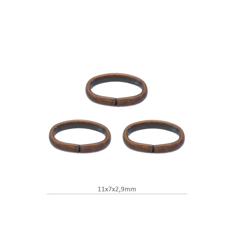 - Anilla ovalada grapa de latón en color cobre. - El tamaño es de 11x7 milímetros y tiene un grosor de 2,9 milímetros. - El precio es por bolsa y la bolsa contiene 4 unidades.