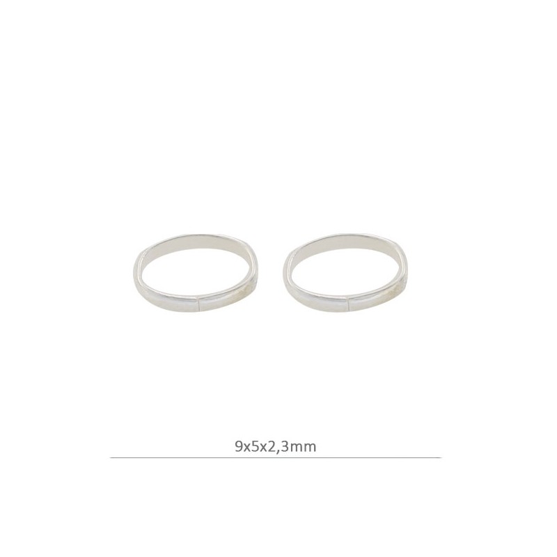 - Anilla ovalada grapa de latón en color plateado. - El tamaño es de 9x7 milímetros y tiene un grosor de 2,3 milímetros. - El precio es por bolsa y la bolsa contiene 6 unidades.