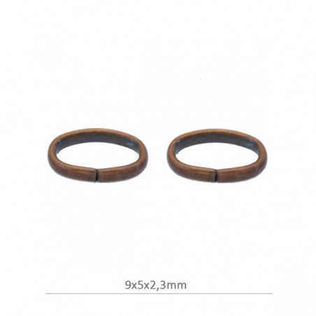 - Anilla ovalada grapa de latón en color cobre. - El tamaño es de 9x7 milímetros y tiene un grosor de 2,3 milímetros. - El precio es por bolsa y la bolsa contiene 6 unidades.