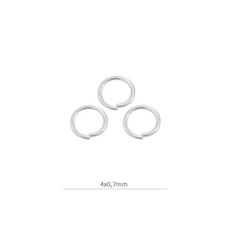 - Anilla abierta redonda de latón en color plateado. - Tamaño de 4x0,7 milímetros. - El precio es por bolsa y la bolsa contiene 20 unidades.