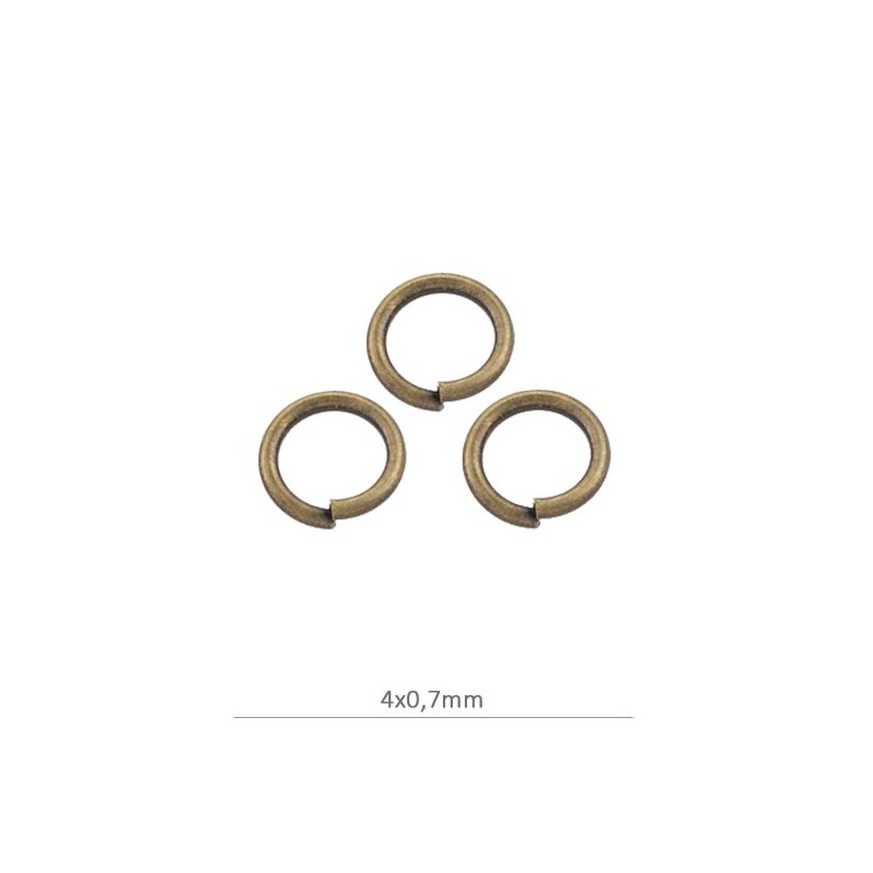 - Anilla abierta redonda de latón en color oro viejo. - Tamaño de 4x0,7 milímetros. - El precio es por bolsa y la bolsa contiene 20 unidades.