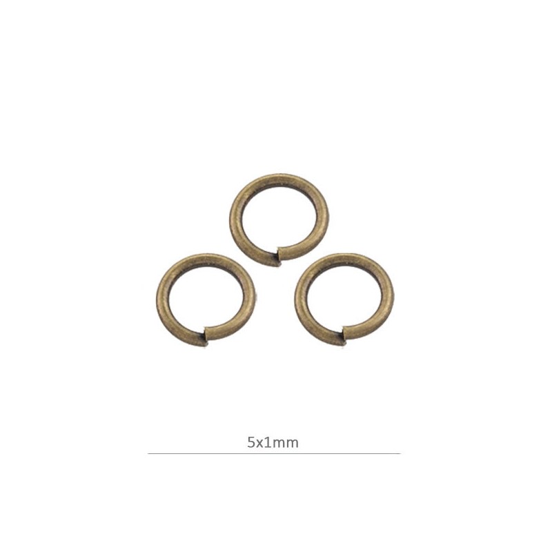 - Anilla redonda abierta de latón en color oro viejo. - El tamaño es de 5x1 milímetros. - El precio es por bolsa y la bolsa contiene 20 unidades.