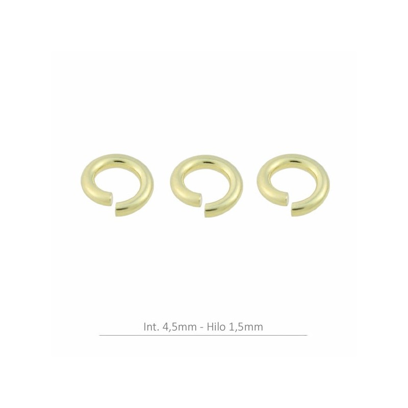 Anilla tamaño grande,de plata con un baño de oro. La bolsa contiene 1 unidad y el hilo es de 1,5 mm. El diámetro interior es de 4,5 mm. y el diámetro exterior es de 7,5 mm.