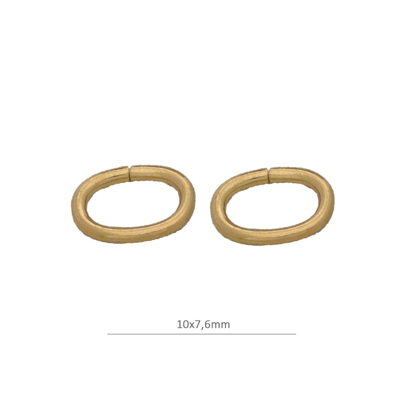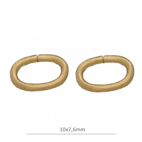 - Anilla ovalada abierta de latón en color dorado. - El tamaño es de 7,6x10 milímetros y el grosor es de 1.3 milímetros. - El precio es por bolsa y la bolsa contiene 5 unidades.