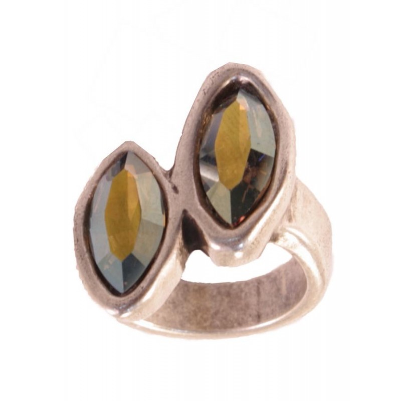 Anillo en zamak con baño plata y dos cristales Swarovski color Green Iris. Le recomendamos pegar ambas piezas con nuestro pegamento especial para joyería con referencia 7405.