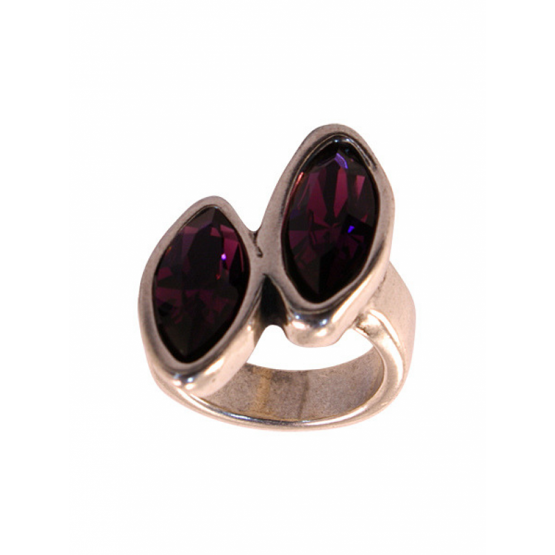 Anillo en zamak con baño plata y dos cristales Swarovski color Amathyste. Le recomendamos pegar ambas piezas con nuestro pegamento especial para joyería con referencia 7405.