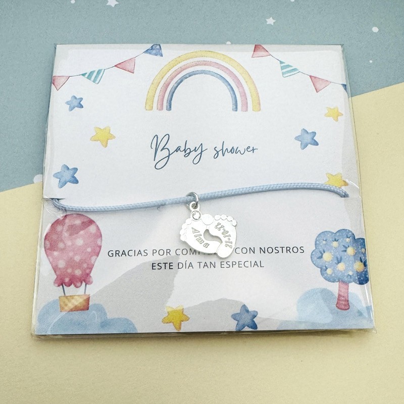Sorprende a tus invitados creando a mano los detalles de tu fiesta de baby shower, regalándoles esta preciosa pulsera con colgante de pies que podrá llevar todos los días para recordar ese bonito día. El color que tiene en la foto es el azul celeste.