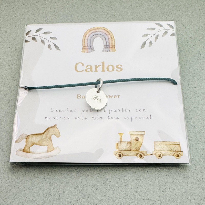 Sorprende a tus invitados creando a mano los detalles de tu fiesta de baby shower, regalándoles esta preciosa pulsera con colgante arcoiris que podrá llevar todos los días para recordar ese bonito día. El color que tiene en la foto es el turquesa.