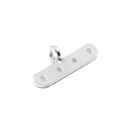 Separador de hilos para collares o pulseras, de 4 taladros, con anilla, en plata de ley. La bolsa contiene 1 unidad. El tamaño es de 18x4 mm. y la anilla es de 5 mm.