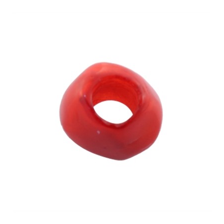 - Bola achatada de resina en color rojo. - Tamaño de 9 a 12 milímetros. - Taladro 5.5 milímetros. - Base plana y forma irregular. - El precio es por bolsa y la bolsa incluye dos unidades.