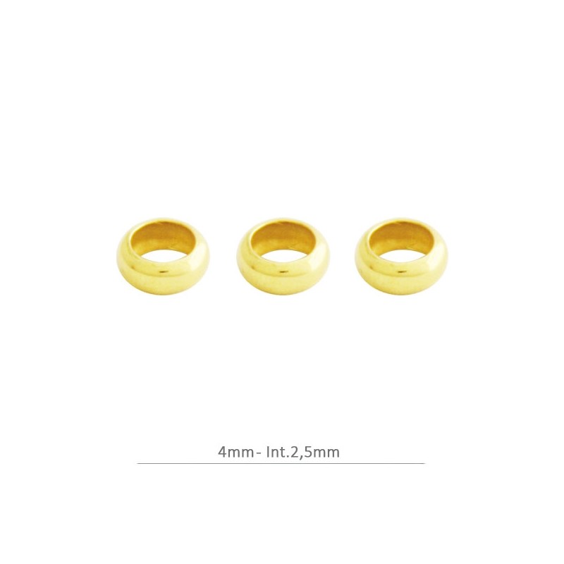 - Donuts en plata de ley baño oro. - El tamaño exterior es de 4 milímetros y el interior es de 2,5 milímetros. - El precio es por bolsa y la bolsa contiene 6 unidades.
