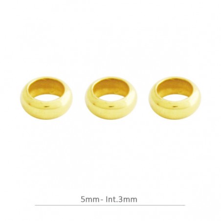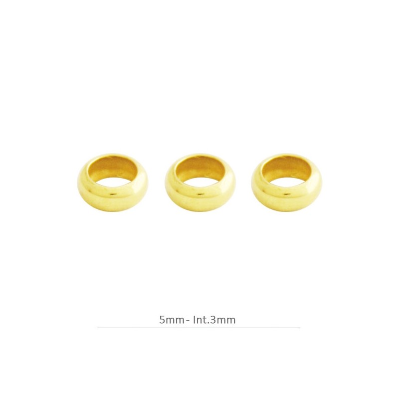 - Donuts en plata de ley baño oro. - El tamaño exterior es de 5 milímetros y el interior es de 3 milímetros. - El precio es por bolsa y la bolsa contiene 4 unidades.