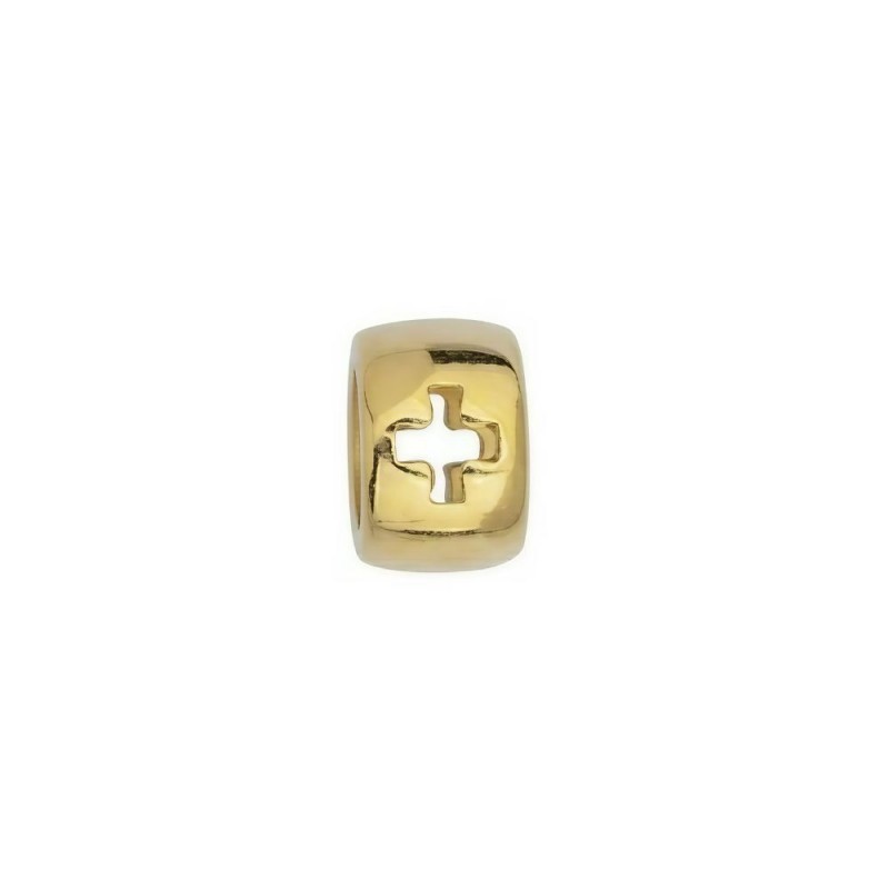 Cuenta donut con cruz calada de 9mm con interior de 6mm en zamak con baño de oro 24k.