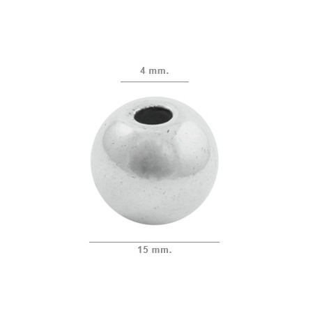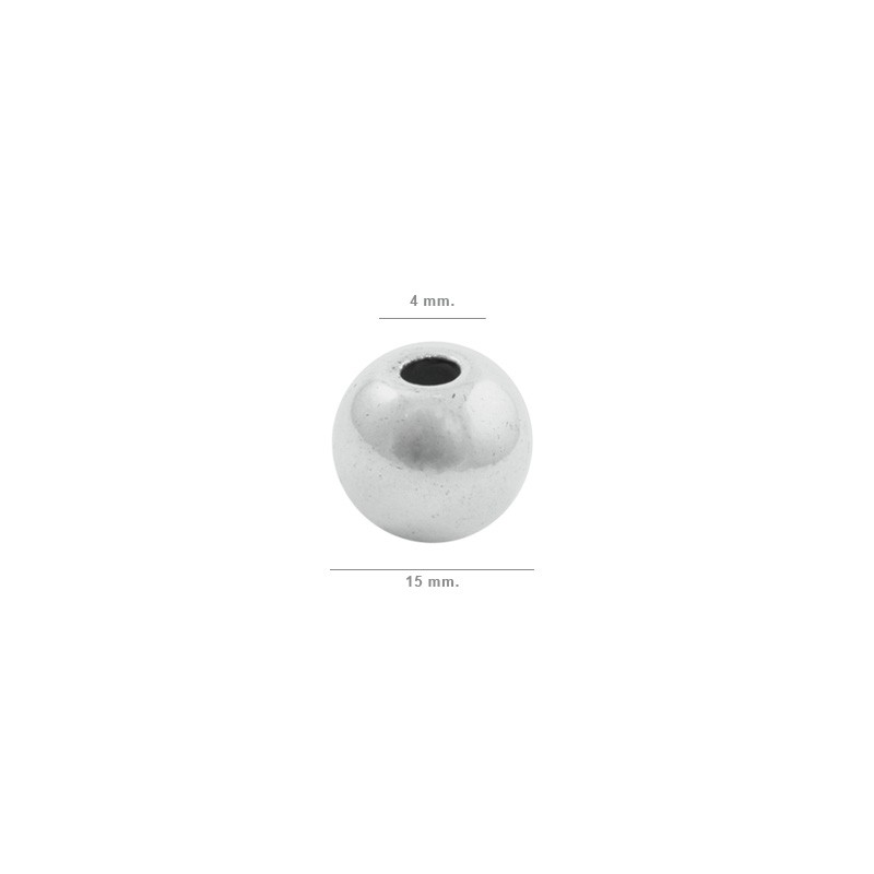Bola en zamak con baño de plata. La bolsa contiene 1 unidad. El diámetro exterior es de 15 mm. y el taladro es de 4 mm.