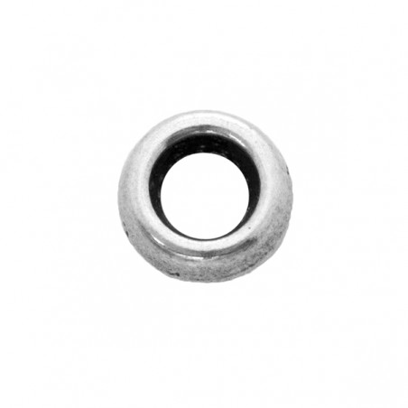 - Donut de zamak con baño de plata vieja. - El tamaño es de 6,5 milímetros y tiene un taladro interior de 4 milímetros. - El precio es por bolsa y la bolsa contiene 25 unidades.
