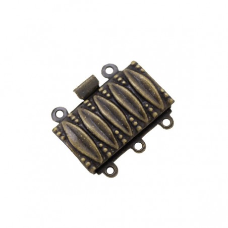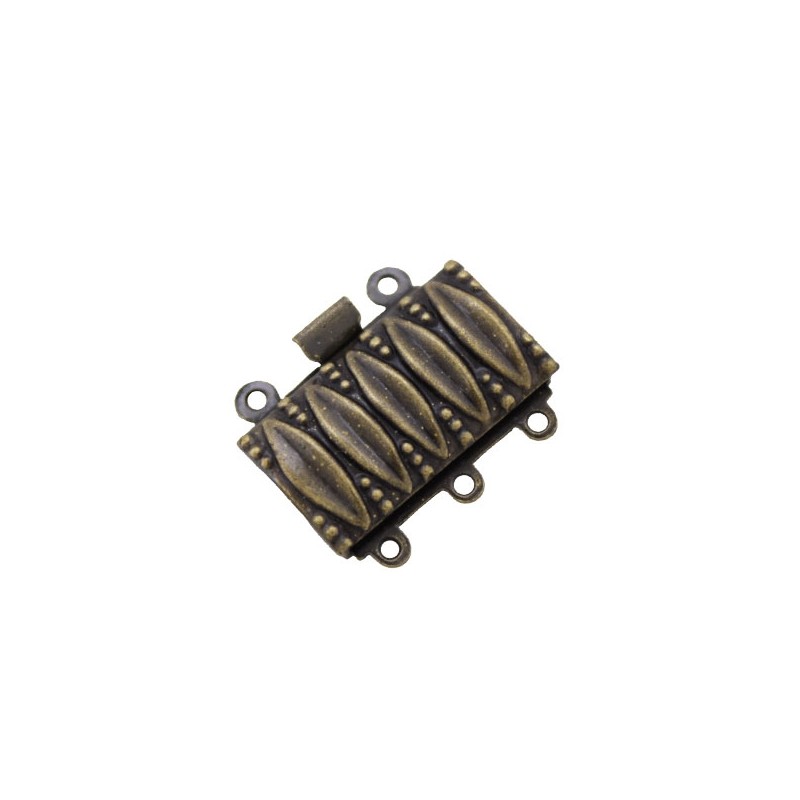 Cierre de caja de 3 vueltas granulado de latón en color oro viejo. La bolsa contiene 1 unidad. El tamaño es de 19x13 mm. y tiene unos taladros de 1,5 mm.