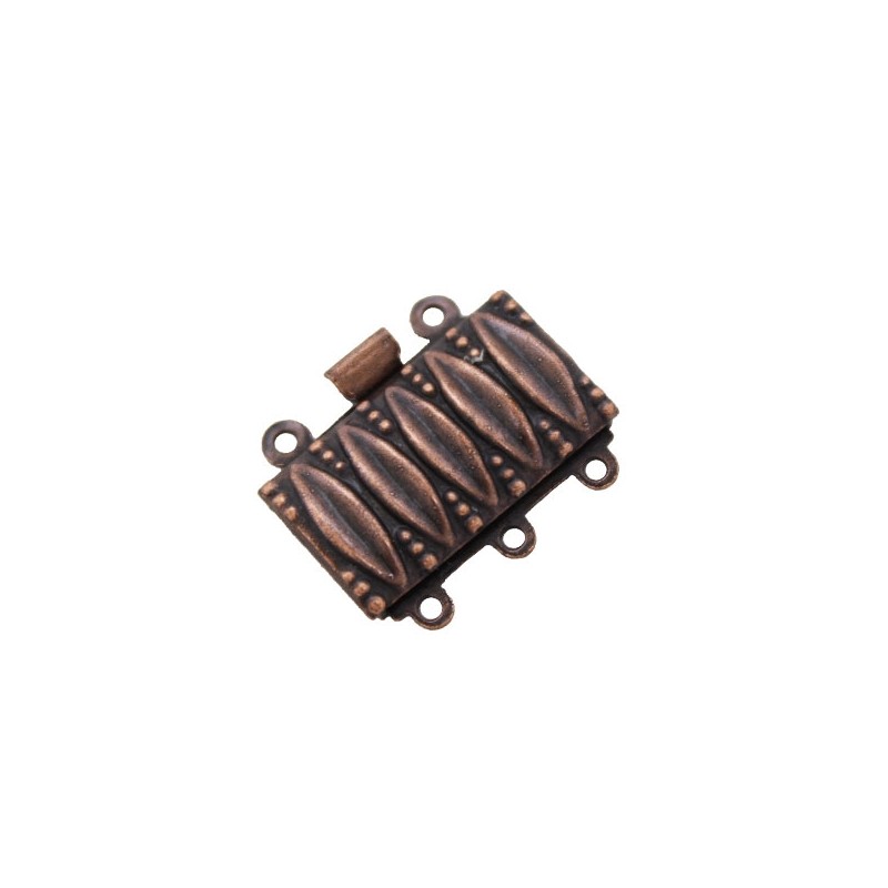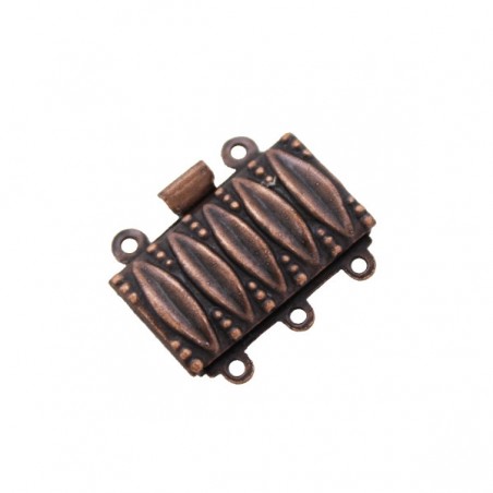 Cierre de caja de 3 vueltas granulado de latón en color cobre. La bolsa contiene 1 unidad. El tamaño es de 19x13 mm. y tiene unos taladros de 1,5 mm.