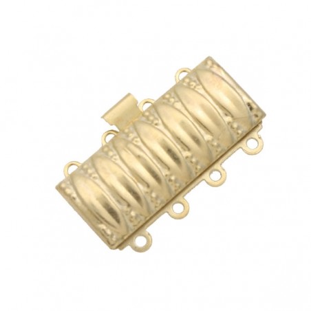 Cierre caja 4 vueltas granulado de latón en color dorado. La bolsa contiene 1 unidad y el tamaño es de 26x13 mm.