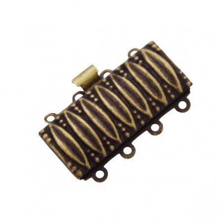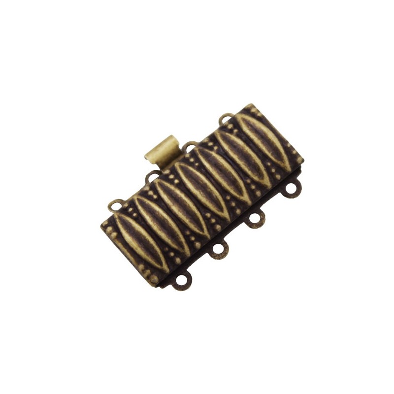 Cierre caja 4 vueltas granulado de latón en color oro viejo. La bolsa contiene 1 unidad y el tamaño es de 26x13 mm.