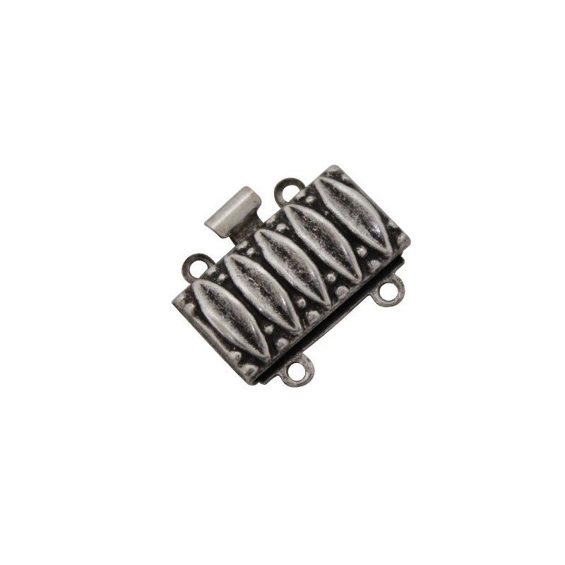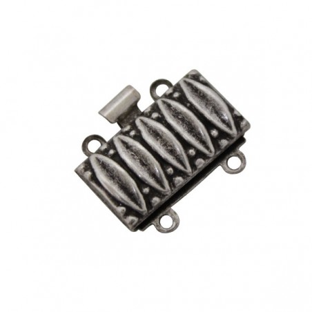 Cierre de caja granulado de 2 vueltas de latón en color plata vieja. La bolsa contiene 1 unidad. El tamaño es de 16x4 mm. y tiene taladros de 1 mm.