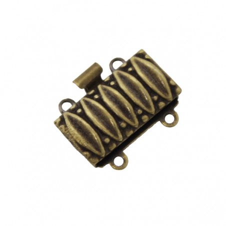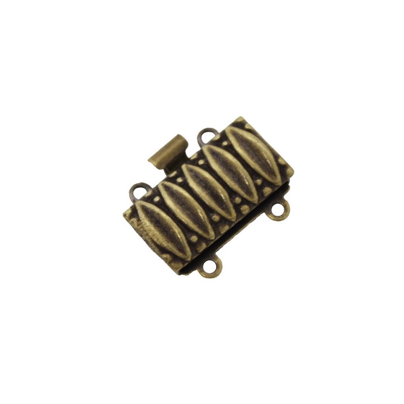 Cierre de caja granulado de 2 vueltas de latón en color oro viejo. La bolsa contiene 1 unidad. El tamaño es de 16x4 mm. y tiene taladros de 1 mm.