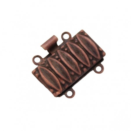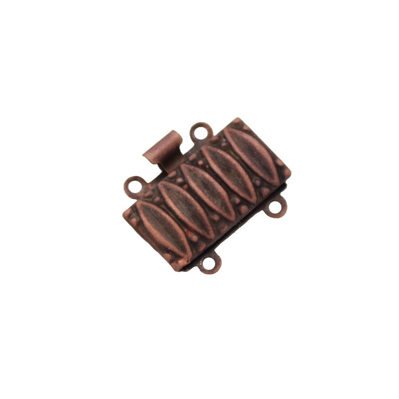 Cierre de caja granulado de 2 vueltas de latón en color cobre. La bolsa contiene 1 unidad. El tamaño es de 16x4 mm. y tiene taladros de 1 mm.