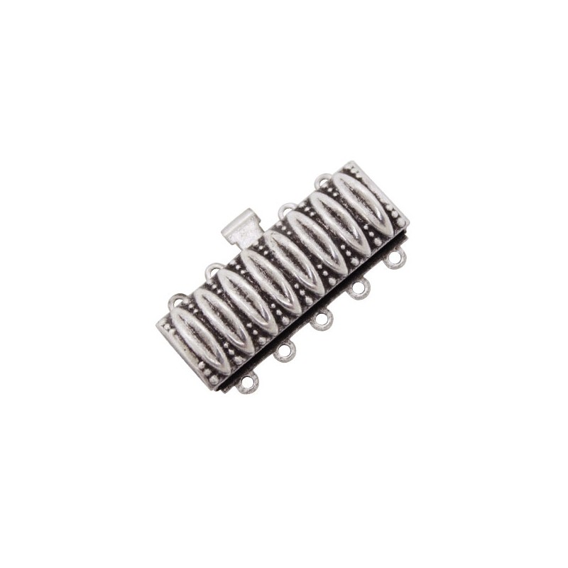 Cierre de caja de 5 vueltas granulado de latón en color plata vieja. La bolsa contiene 1 unidad. El tamaño es de 30x17 mm. y tiene unos taladros de 1 mm.