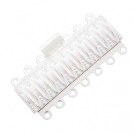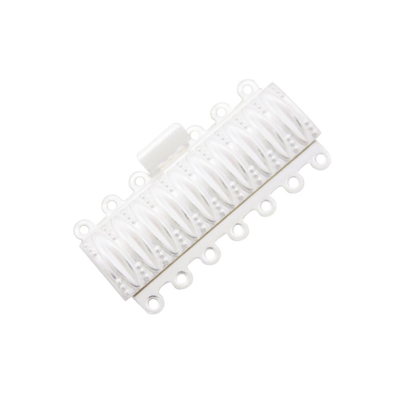 Cierre de caja granulado de 7 vueltas de latón en color plateado. La bolsa contiene 1 unidad. El tamaño es de 37 x 14 mm.