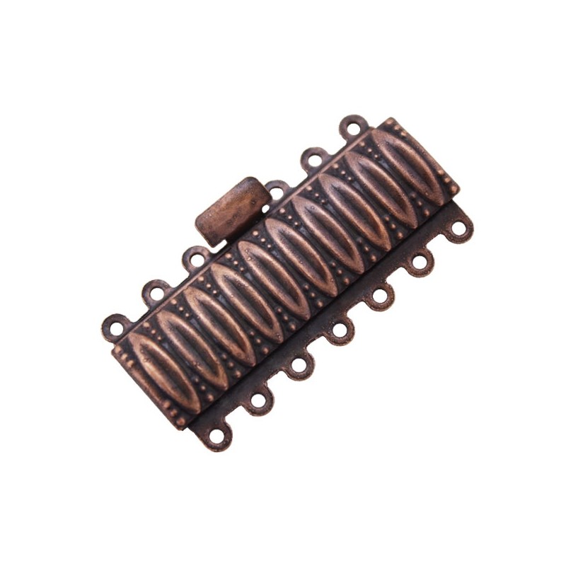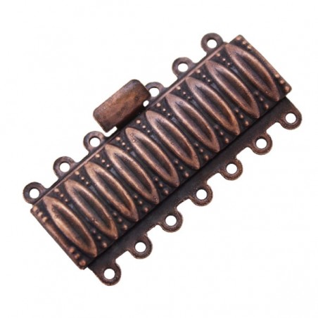 Cierre caja 7 vueltas granulado de latón en color cobre. La bolsa contiene 1 unidad y el tamaño es de 37x14 mm.