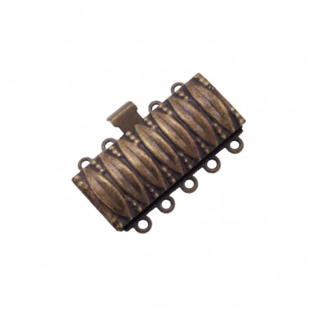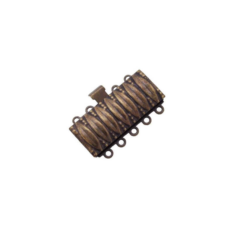 Cierre de caja de 5 vueltas granulado de latón en color oro viejo. La bolsa contiene 1 unidad. El tamaño es de 25x17 mm. y tiene unos taladros de 1.5 mm.