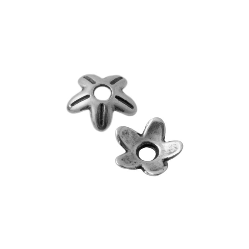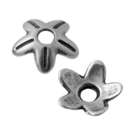 Casquilla flor en zamak con baño de plata. La bolsa contiene 2 unidades. El tamaño es de 9 mm. y el taladro es de 2 mm.