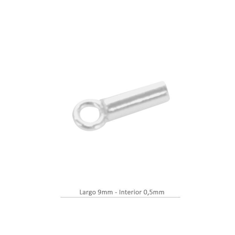 Terminal de tubo cerrado con asa para cordón o cable de 0,5 mm. El tubo es de 5,5x9 mm de largo y 0,5 mm de interior en plata de ley 925. Fabricado en España.