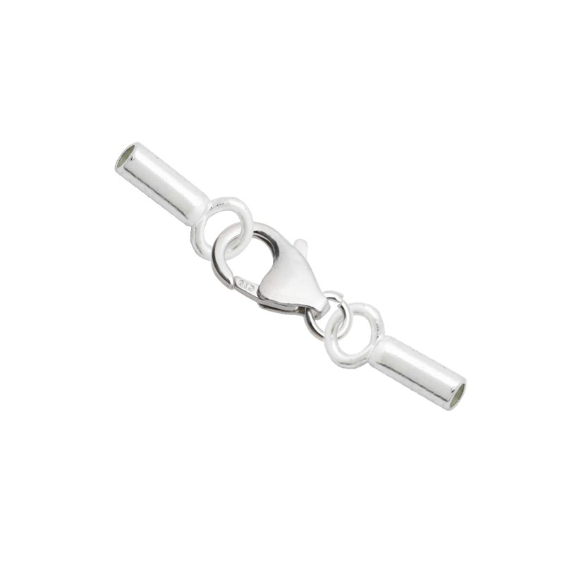 Cierre montado de tubo con mosquetón para cordón de 1,5 mm. El tubo es de 8 mm de largo y 1,8 mm de interior en plata de ley 925. Fabricado en España.