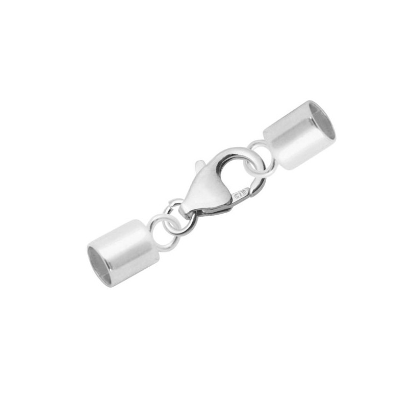 Cierre tubo cerrado con mosquetón para cordón de 4 mm. El tubo es de 5,3 mm de largo y 4,1 mm de interior en plata de ley 925. Fabricado en España.