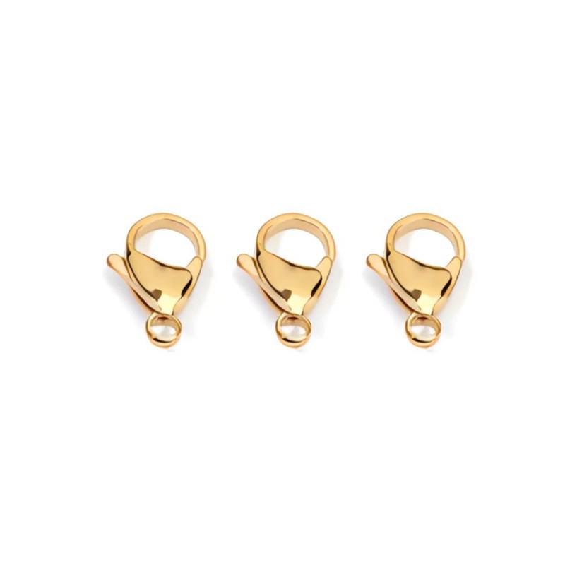 Cierre mosquetón en acero inoxidable dorado de 15 mm de largo.