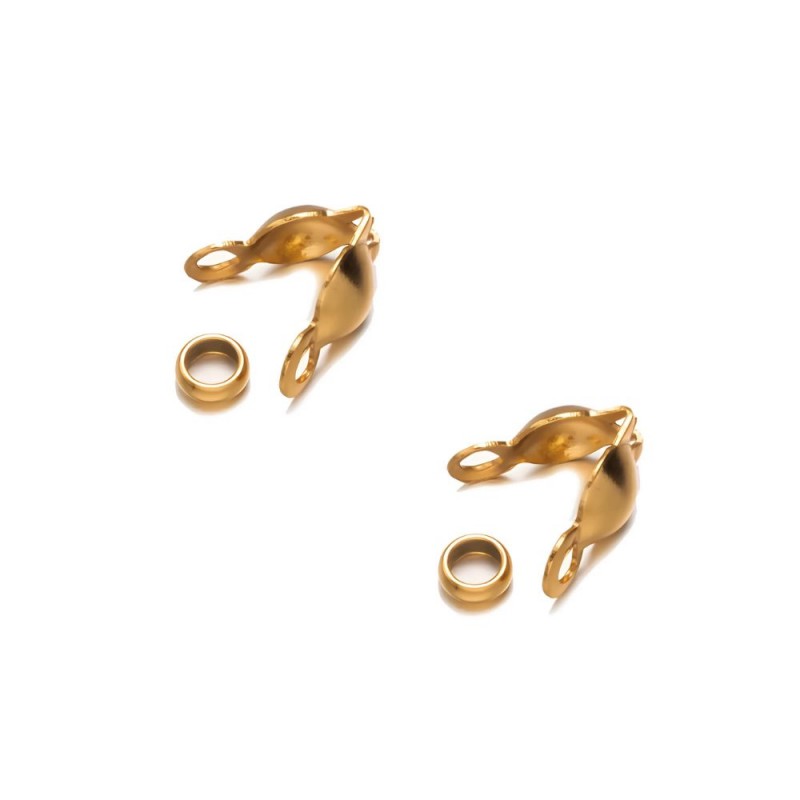 Terminal tapanudo de tamaño 8x4mm con anilla y chafa en acero inoxidable dorado.